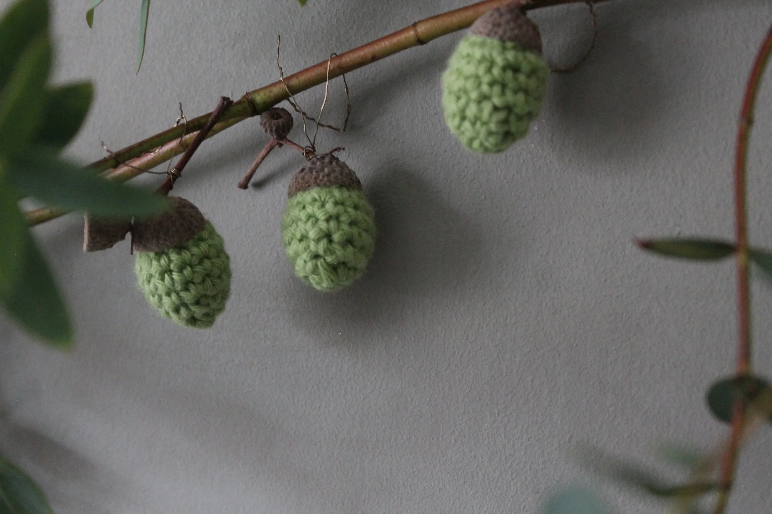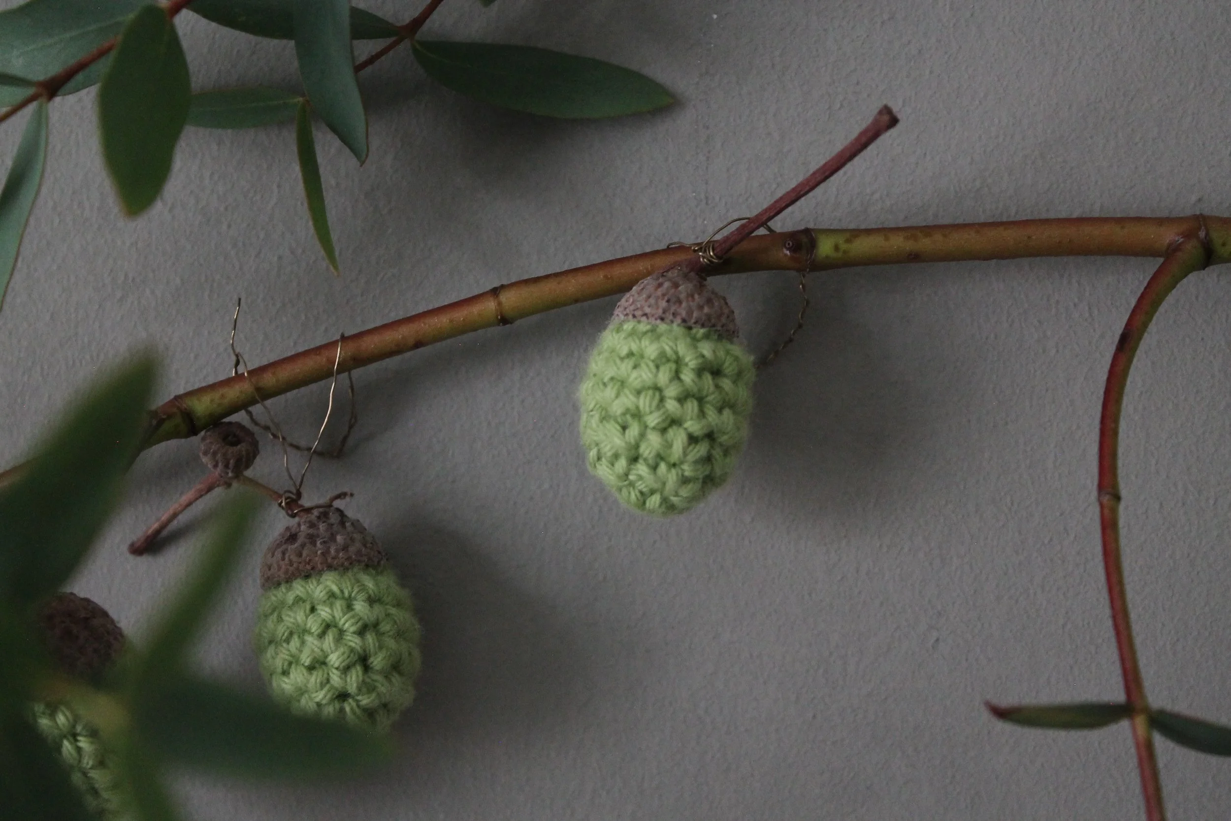 A set of three meticulously crafted crochet acorns, adorned with real acorn caps and equipped with delicate wire hangers perfect for Christmas.
